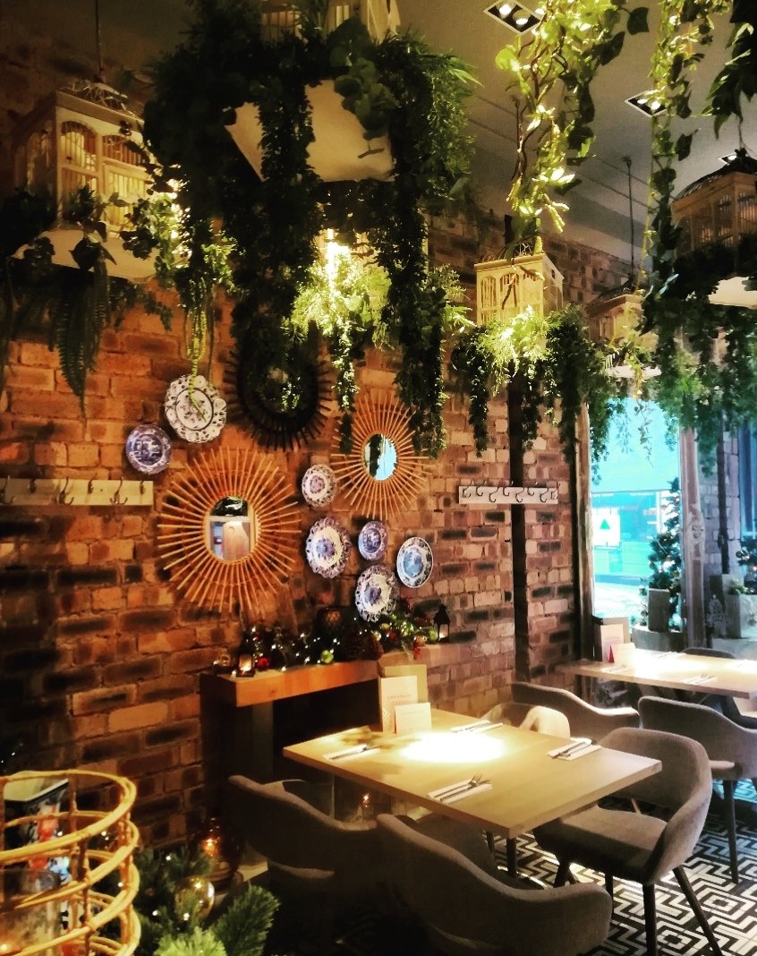 Evidently, this is where the real magic happens. As I gazed with wonder at my surroundings, trying not to draw attention to myself, I was reminded of a scene from The Hobbit, specifically the one where, in Peter Jackson’s, The Desolation of Smaug, the viewer encounters Lothlórien – kingdom of the Wood Elves. Sporadically placed across the ceilings, are softly illuminated hanging bird cages, trailing waterfalls of foliage, complimenting the green hue of pale light blushing from behind the bar. Potted plants and bare brick walls adorned with gold, sunburst mirrors create a honeyed radiance, and give the impression of basking in a wooded glen at sunset. The restaurant is spacious, with a wealth of tables to choose from, though it did not appear overcrowded or busy. For those requiring more intimacy, a handful of booths ensconced a little distance away from the main bustle of the eatery are provided, beside a snuggly situated and gorgeously bedecked dining room available for private hire.